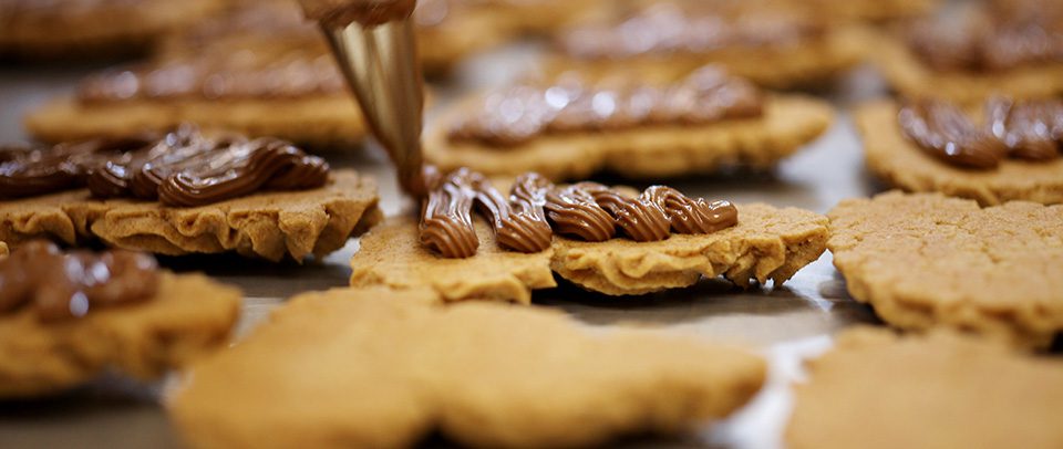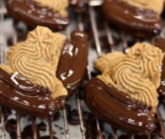 Zarter Spritz-Mürbeteig aus der ErdmannHAUSER-Backmanufaktur, von Hand üppig gefüllt mit cremigem Nuss-Nougat und in dunkle Schokolade getaucht.