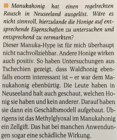 Laut Aussage von Professor Dr. Karsten Münstedt, einem anerkannten Arzt, Wissenschaftler und Spezialisten zum Thema Gesundheit durch Bienenprodukte, ist Wald-Honig dem Manukahonig ebenbürtig. Auch wenn wir diese Sicht schon lange teilen, so ist es dennoch schön es auch von einem renommierten Mediziner bestätigt zu bekommen.